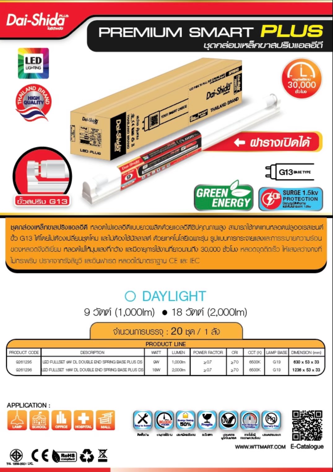 DAI-SHIDA+ (ไดชิด้าพลัส) SETหลอดไฟ LED T8 9วัตต์ แสงขาว ขั้้วสปริง พร้อมติดตั้ง แพ็ค 20ดวง/ลัง