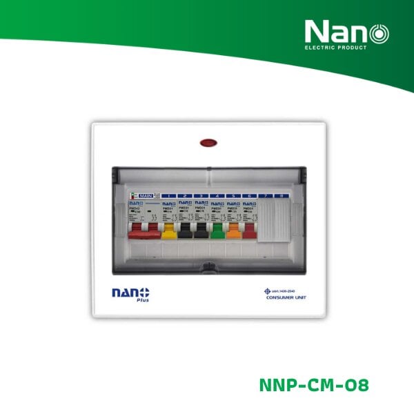ตู้คอนซูมเมอร์ ยี่ห้อ NANO แบบเกาะราง มีไฟเปิด-ปิด บอกสถานะ มีกันดูด สำเร็จรูป (ฝาพลาสติก/กล่องเหล็ก) (NNP-CM63B-08 เมน63แอมป์+ลูกย่อย6ตัว)